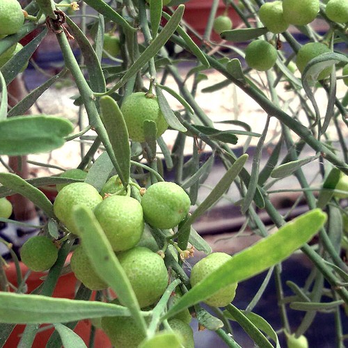 I frutti sono di piccole dimensioni, 15-20 mm di diametro di forma globosa e di colore giallo-verde; hanno una buccia sottile, un aroma piacevolmente acidulo con un sentore di “selvaggio” molto interessante, come il Microcitrus australasica non ha spicchi ma piccole vescicole colme di succo che scoppiettano in bocca quando si addentano.